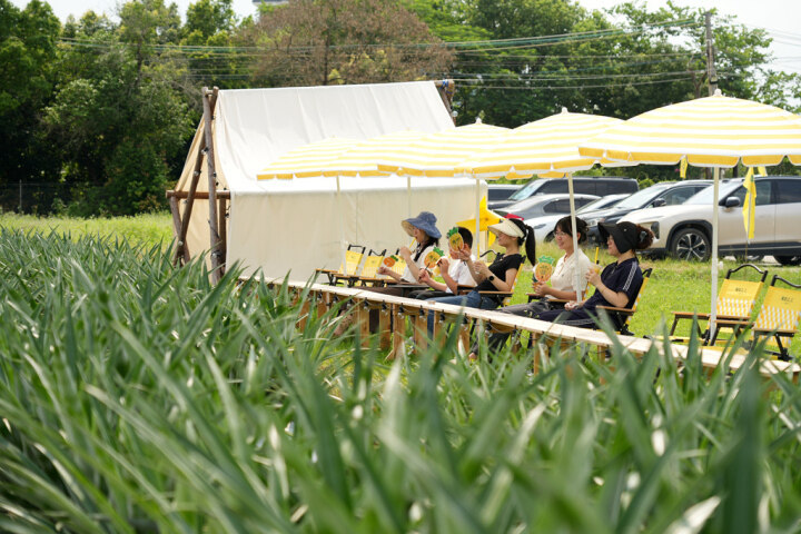 例如用凤梨延伸产品,制作凤梨冰、凤梨美式、凤梨苦瓜鸡锅等,备受顾客喜爱。白天采摘,来一杯凤梨冰,冰爽香甜,解暑神器;傍晚露营,彩灯温馨浪漫,围坐享用凤梨苦瓜鸡锅,游客们欢声笑语,尽享美好时光。