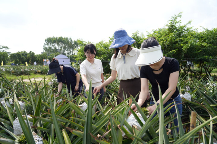 踏入营地,连片凤梨长势喜人,一垄垄凤梨整齐排开,套袋的凤梨在绿油油的叶子映衬下,宛如含苞待放的花朵。游客穿梭其间,轻拆套袋,金黄饱满的凤梨在阳光下闪耀着诱人光泽,大家手持工具精心采摘,欢声笑语弥漫田间。