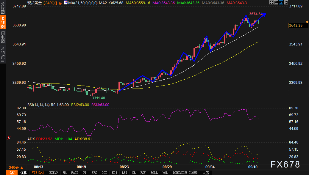 (现货黄金4小时图 来源:易汇通)从4小时图来看,现货黄金的看涨结构持续延伸。自8月底在3300美元附近触底以来,金价形成了一系列“更高高点”和“更高低点”的阶梯式上涨形态。本轮涨势的最新阶段已将金价推升至3650美元区间,并创下约3675美元的历史新高。