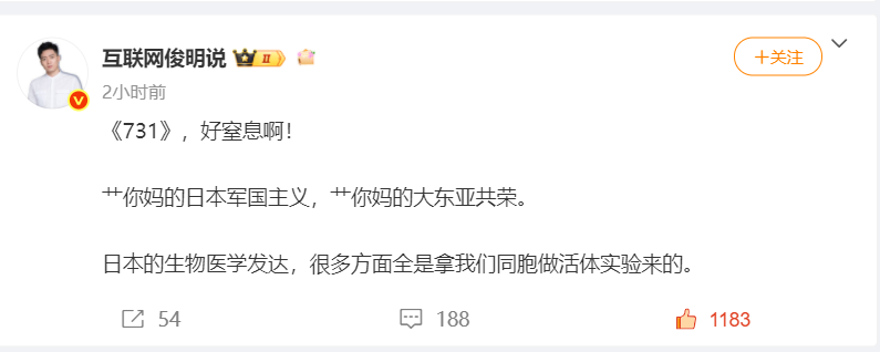 “好窒息啊!X 你 X 的日本军国主义,X 你 X 的大东亚共荣。日本的生物医学发达,很多方面全是拿我们同胞做活体实验来的。”