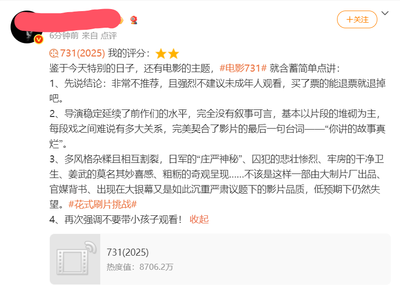 上午,第一场放映结束后,各大平台瞬间被关于《731》的讨论刷爆,博主们纷纷各抒己见,一时间,影片的口碑呈现出两极分化的态势。