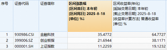 注:统计区间2025.1.1-2025.8.18。中证金融科技主题指数基日为2014.6.30,发布日期为2017.6.22,2020-2024年年度涨跌幅分别为:10.46%、7.16%、-21.40%、10.03%、31.54%。指数成份股构成根据该指数编制规则适时调整,其回测历史业绩不预示指数未来表现。