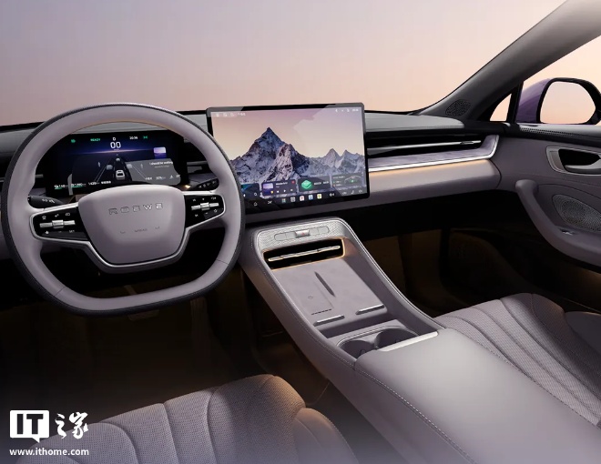内饰方面,荣威 M7 DMH 同样采用了简洁的设计风格。车内配备了双辐式多功能方向盘,具备加热功能,搭配怀挡式换挡机构。采用悬浮式的全液晶仪表和 15.6 英寸中控屏,中控屏下方保留的快捷功能按键则方便驾驶者进行盲操作。车机系统搭载了 SAIC OS,采用高通骁龙 8155 芯片,并配备 AI 语言大模型,支持自定义唤醒词,同时具备手车互联功能,可覆盖华为、OPPO、vivo、小米以及苹果手机,实现手机界面与车机桌面的自动流转,自由使用手机端 App 及相关服务。此外,车内还配备了带透明底盘功能的 360 度全景影像、50 瓦手机无线充电面板、两个水杯架以及较深的中央扶手储物空间。