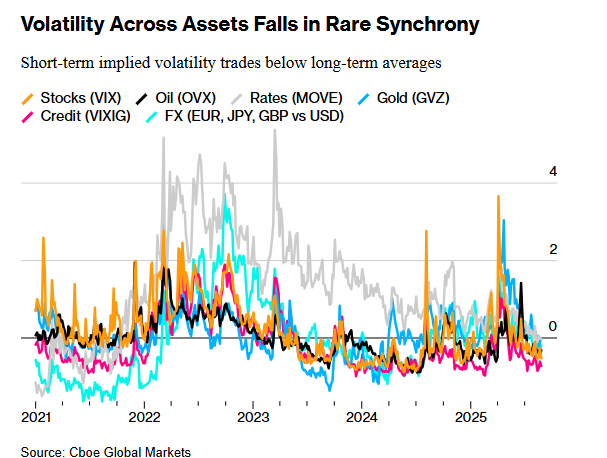 “所有资产的波动性同时下降,是自满情绪的表现,”Capstone Investment Advisors战略投资伙伴关系主管Peter van Dooijeweert表示,“美联储似乎正承受着来自政府的巨大压力,而且未来12个月关税对经济的影响尚不明朗。考虑到未来仍存在诸多不确定性,市场似乎过于放松了。”