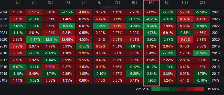 如下图所示,在过去十年里(2015年-2024年),标普500指数有六次在9月出现下跌,平均跌幅为1.93%,为历月最遭,其中更是存在如2022年9月单月暴跌9.34%的“凄惨”案例。
